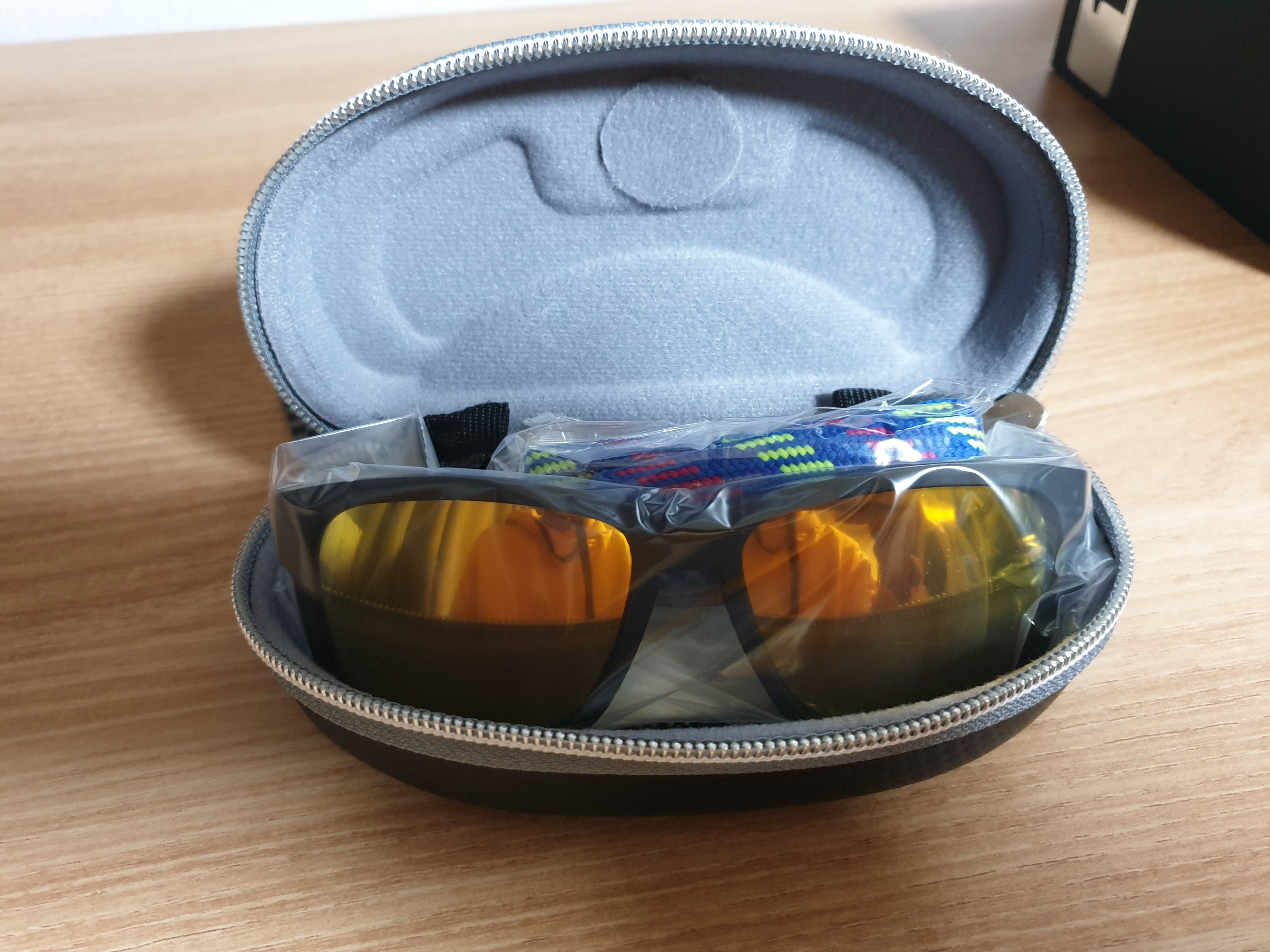 제품 보관 상자를 열면 비닐에 선그라스가 담겨져 있다. 구성은 선그라스, 닦게, 목줄? (설마 저걸하라는건 아니겠지?)로 구성이 되어있다. 저 줄의 정체가 아마 목줄이 맞다면...절대 사용할 일은 없을 것이다 하하하